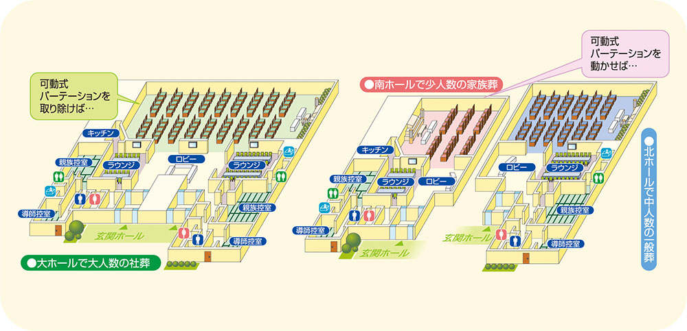 小さなお葬式 氷上ホールは可変式ホールとなっており、パーテーションの移動により、少人数の家族葬から大人数の社葬まで、様々なお葬式に対応できます。